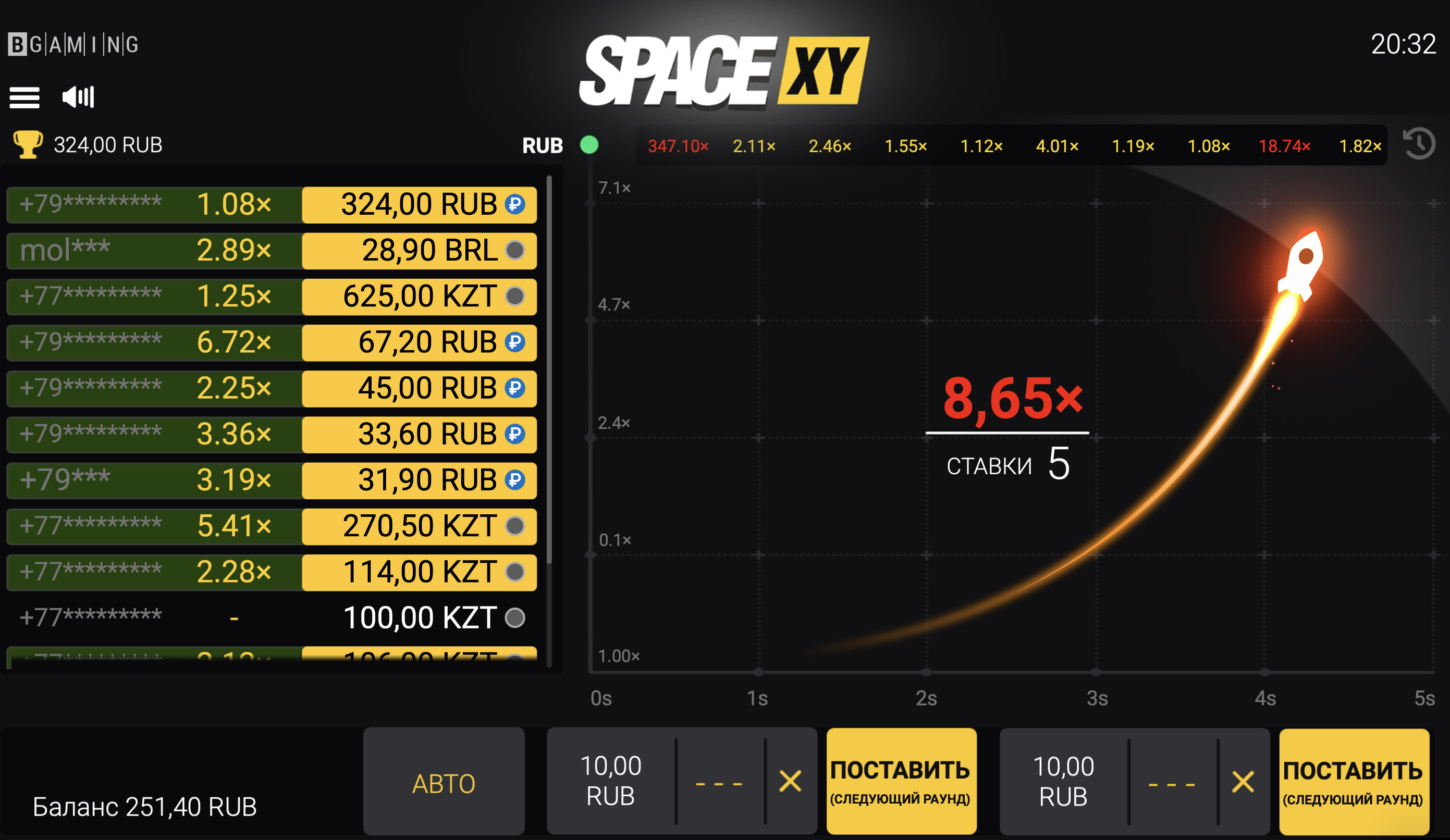 Risk etmək istəyirsinizsə, minimum mərc edin, məsələn, $1 mərc edin. Əmsal dəyərini yüzə təyin edin, həmçinin avtomatik rejimi aktivləşdirin. Əgər şanslısınızsa, 10-30-50 və hətta 100 dollar oyun balansınıza qayıdacaq! Hamısı verilən əmsaldan və raketin uçuş müddətindən asılıdır.