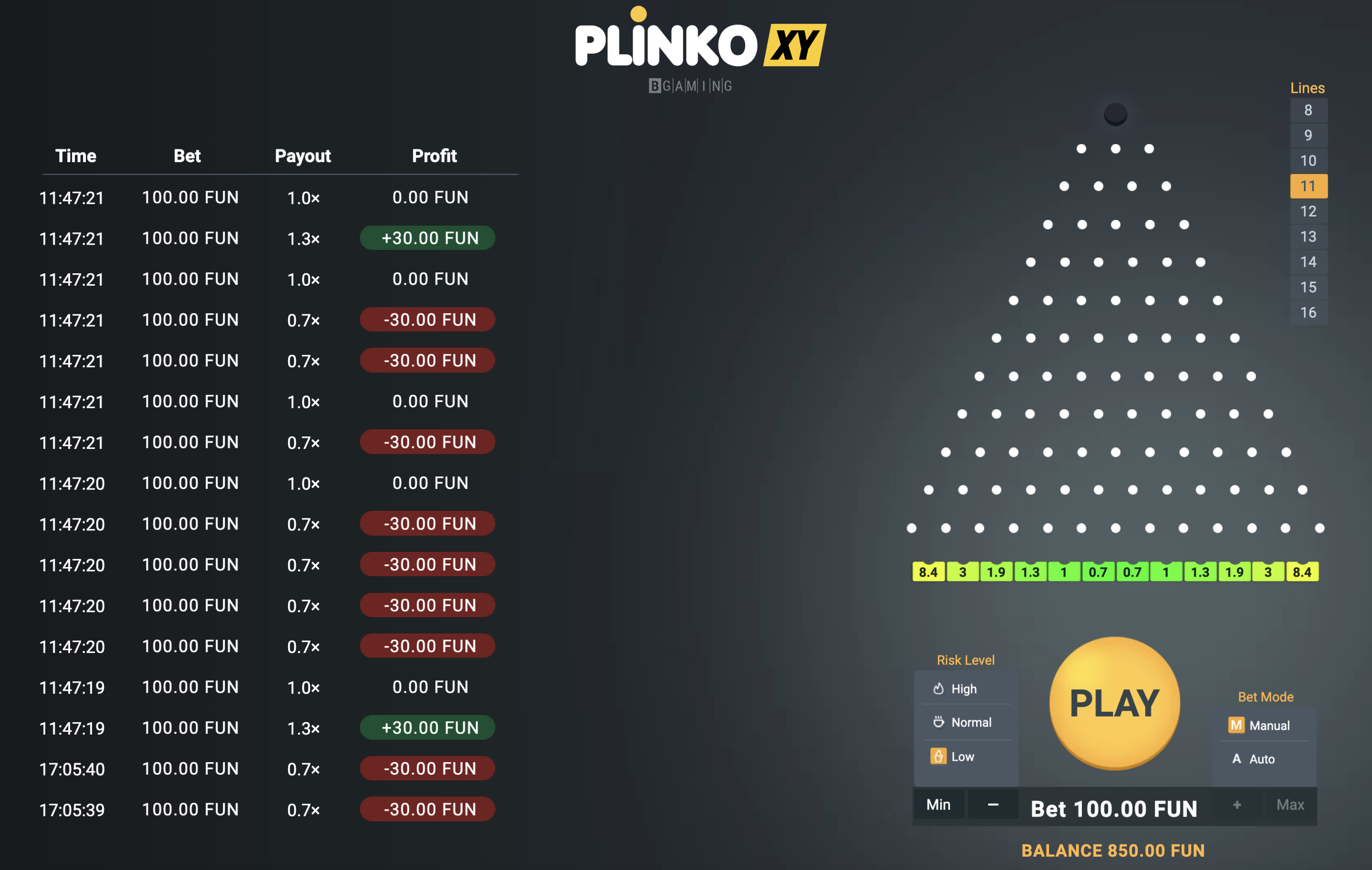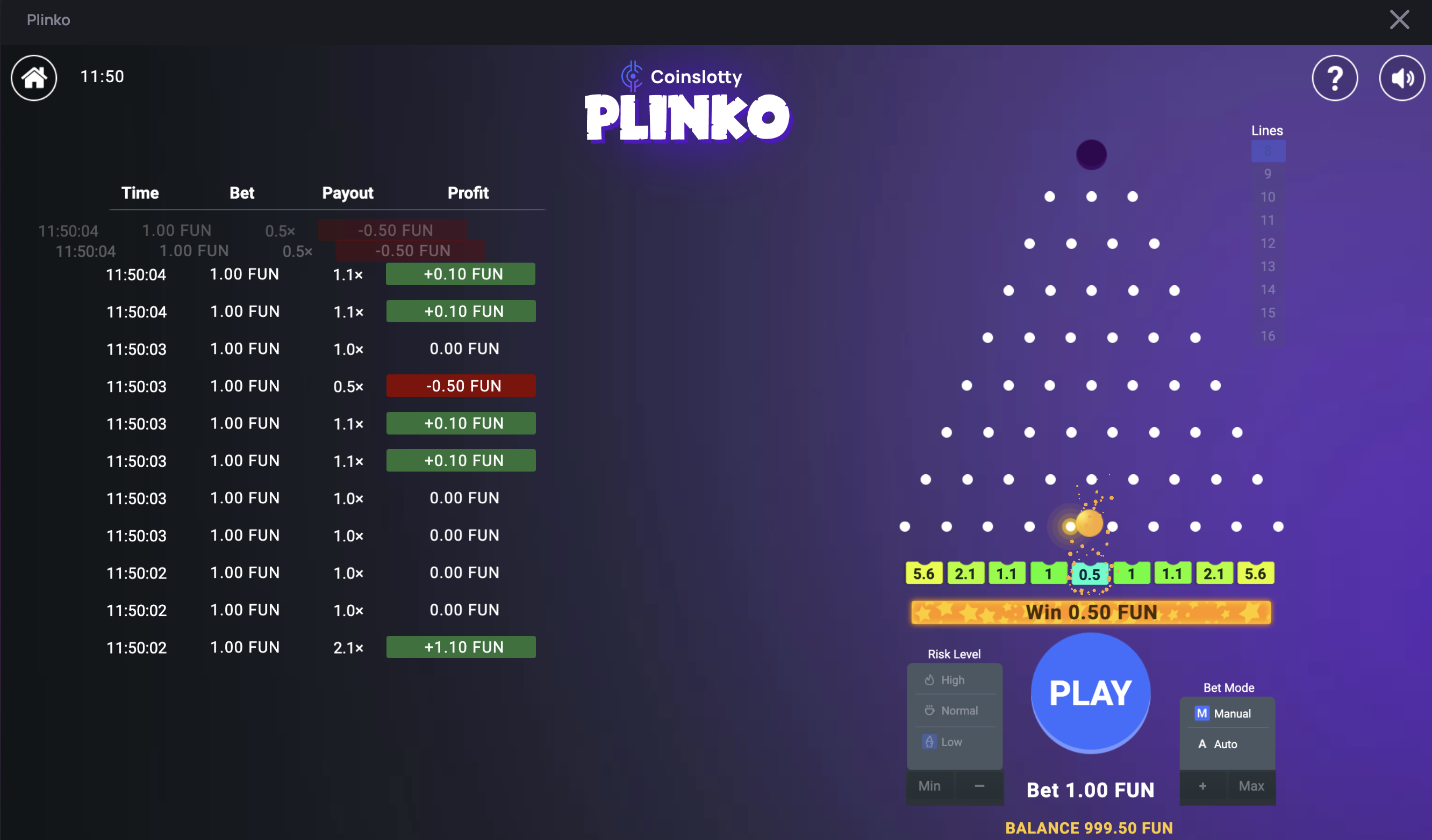 — получение опыта. К чему знакомство с Plinko, когда каждая ставка – это повышенный риск, если можно сначала узнать, как все устроено, в бесплатной версии? Демонстрационный режим исключает убытки, дает возможность освоить как минимум на базовом уровне любую азартную игру. И «Плинко» не является исключением.