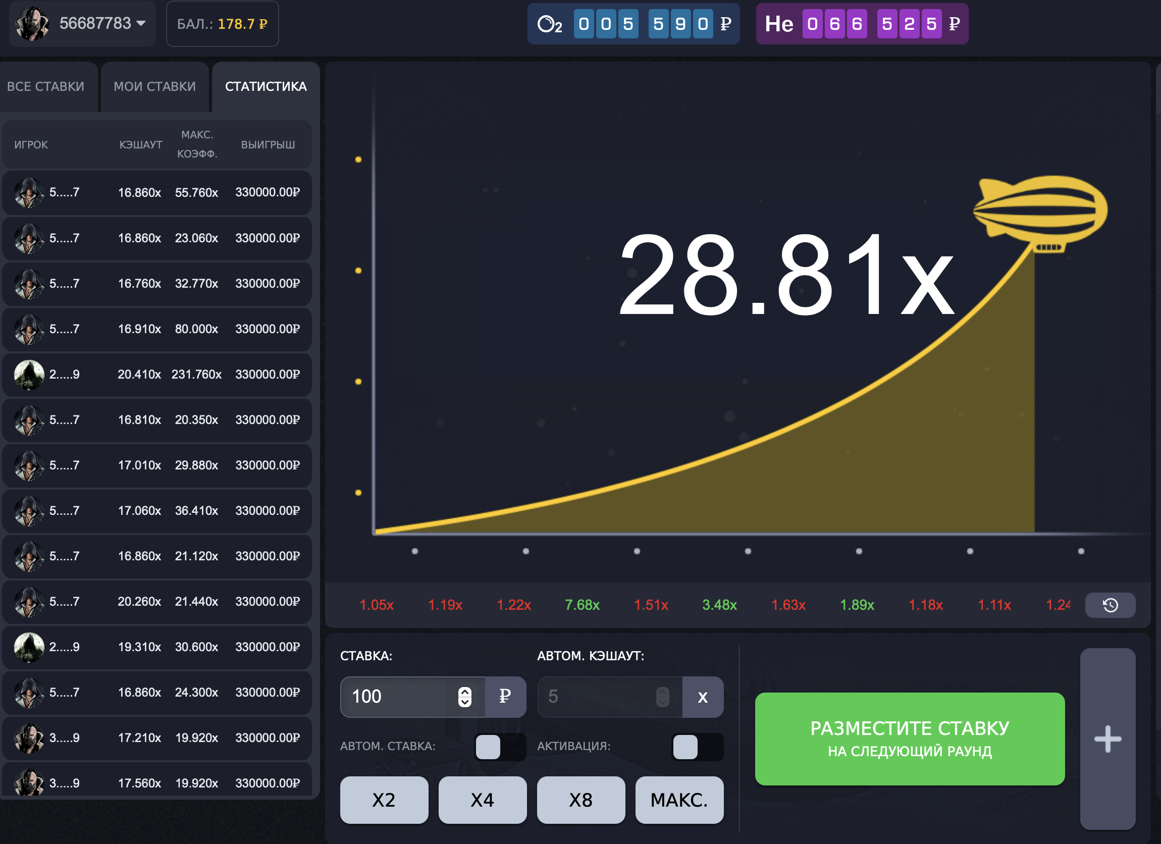 Так, если игрок упускает удачный момент, ставка исчезает. Коэффициент может быть достаточно большим. Редко, но появляются значения от десяти до ста и даже больше. Но это не повод рассчитывать исключительно на удачу и надеяться, что генератор случайных чисел «выдает» желаемое значение. Отмеченные коэффициенты появляются очень редко. Поэтому лучше выбрать стратегию с минимальным риском и делать малые или средние ставки, дожидаться небольших множителей и забирать свое. Так можно заработать неплохие деньги, хотя и придется потратить время.