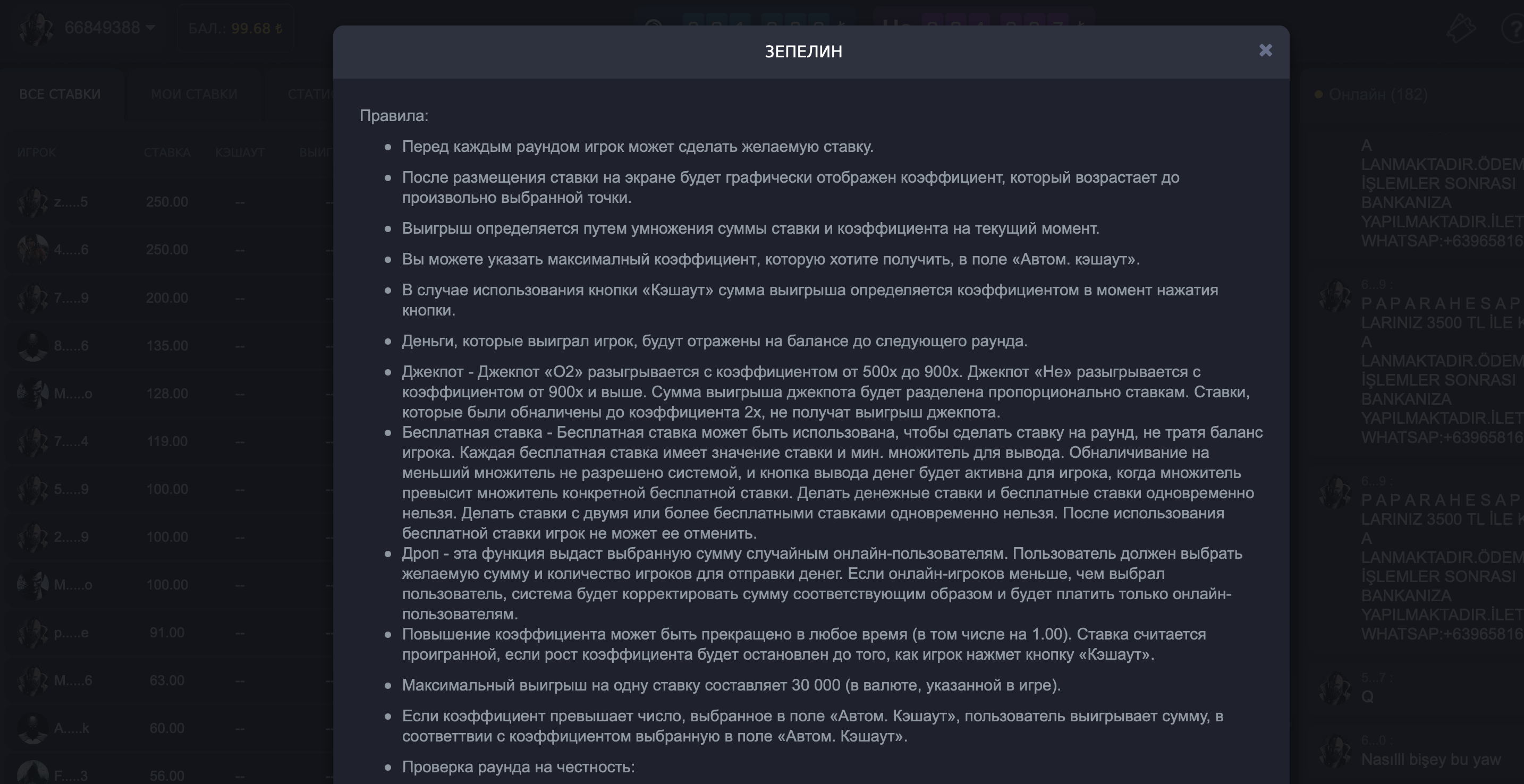 Игровое поле представлено пространством, предназначенным для полета дирижабля. По мере условного набора высоты накапливается множитель. Игрок должен успеть забрать деньги до момента, когда дирижабль взорвется. В этом и заключается суть Zeppelin. Есть ставка, воздушное судно и определенное генератором случайных чисел время полета. Если точнее, то программа устанавливает определенное значение коэффициента в отношении каждого нового игрового раунда. Узнать, каким именно оно является, не могут ни игроки, ни представители казино. Это и делает «Дирижабль» по-настоящему азартной и непредсказуемой игрой!