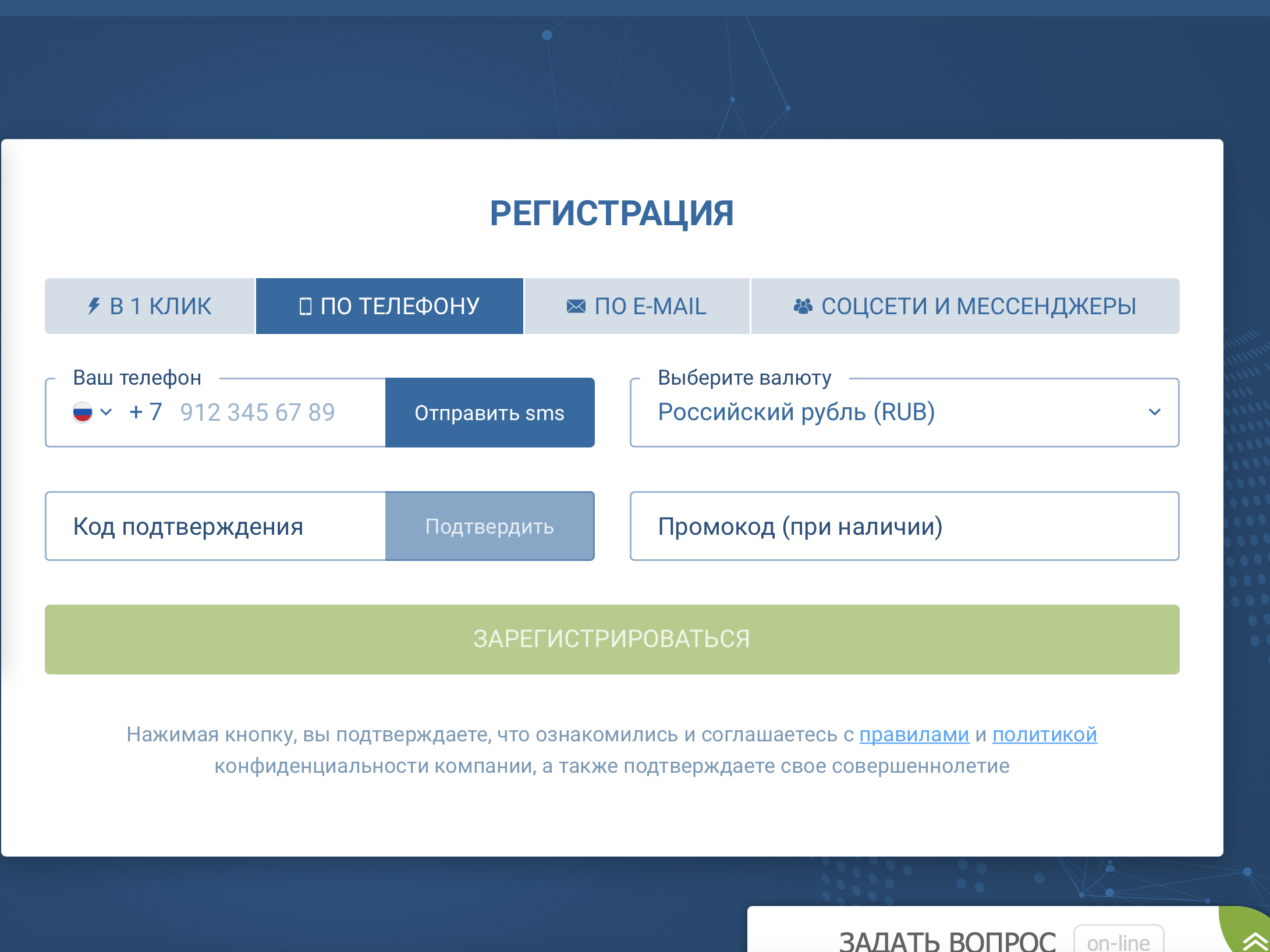 Для регистрации в 1xBet потребуется выбрать один из предложенных вариантов. Можно стать клиентом, если указать номер телефона, адрес электронной почты или ссылку на учетную запись в социальной сети. На регистрацию уходит 1-2 минуты. Сначала нужно найти на главной странице официального сайта 1xBet кнопку «Регистрация», а затем выбрать удобный способ. Нужно придумать пароль, согласиться с условиями пользовательского соглашения. После этого потребуется войти в личный кабинет.