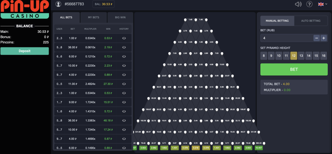 - Seção Pin (“Níveis”). Aqui o jogador pode escolher o número de “pistas” de obstáculos. Estamos falando de barreiras que impedirão que a bola caia com calma. Ele se afastará deles e mudará a direção do movimento para baixo. Como no caso do risco, o número de níveis definido pelo jogador afetará a distribuição de coeficientes e valores em células específicas.