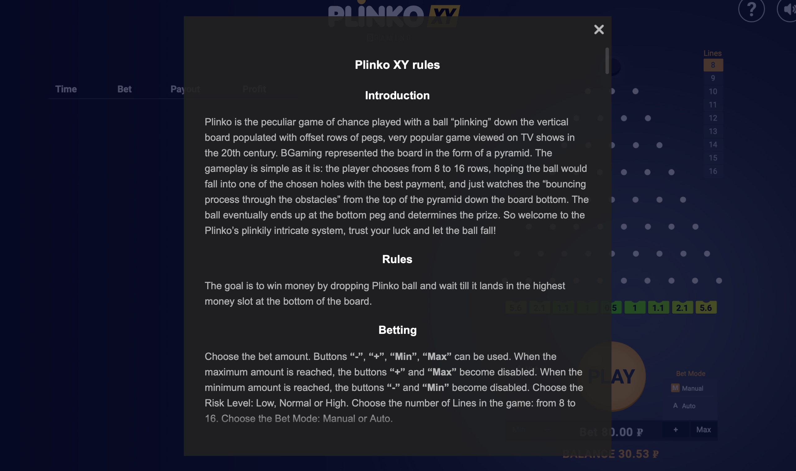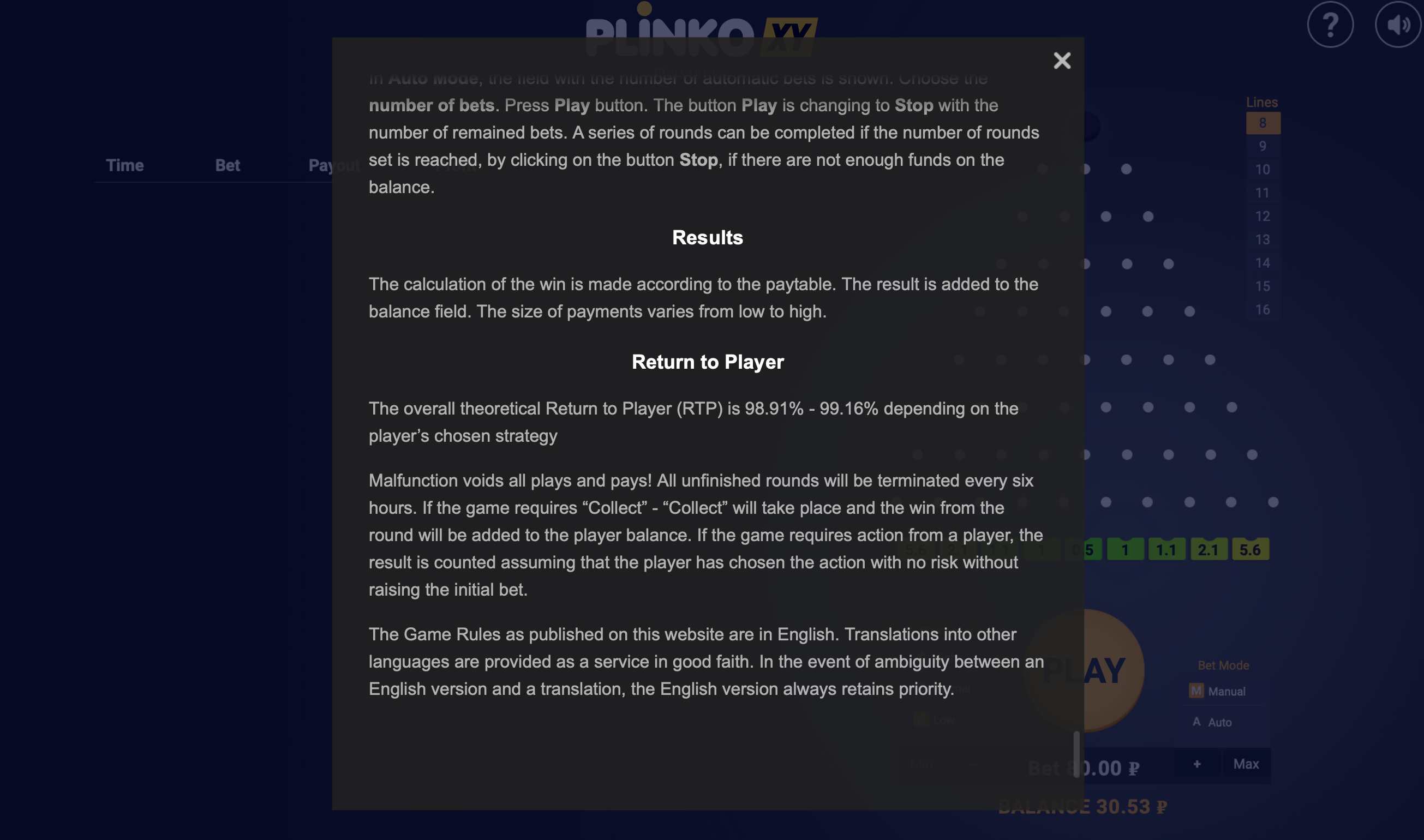 O jogador escolhe o valor da aposta e clica no botão “Jogar”. O jogo manual é possível, existe um jogo automático. Neste último caso, você precisa especificar o número de bolas que, após o início da rodada, o sistema lançará uma a uma no tabuleiro.