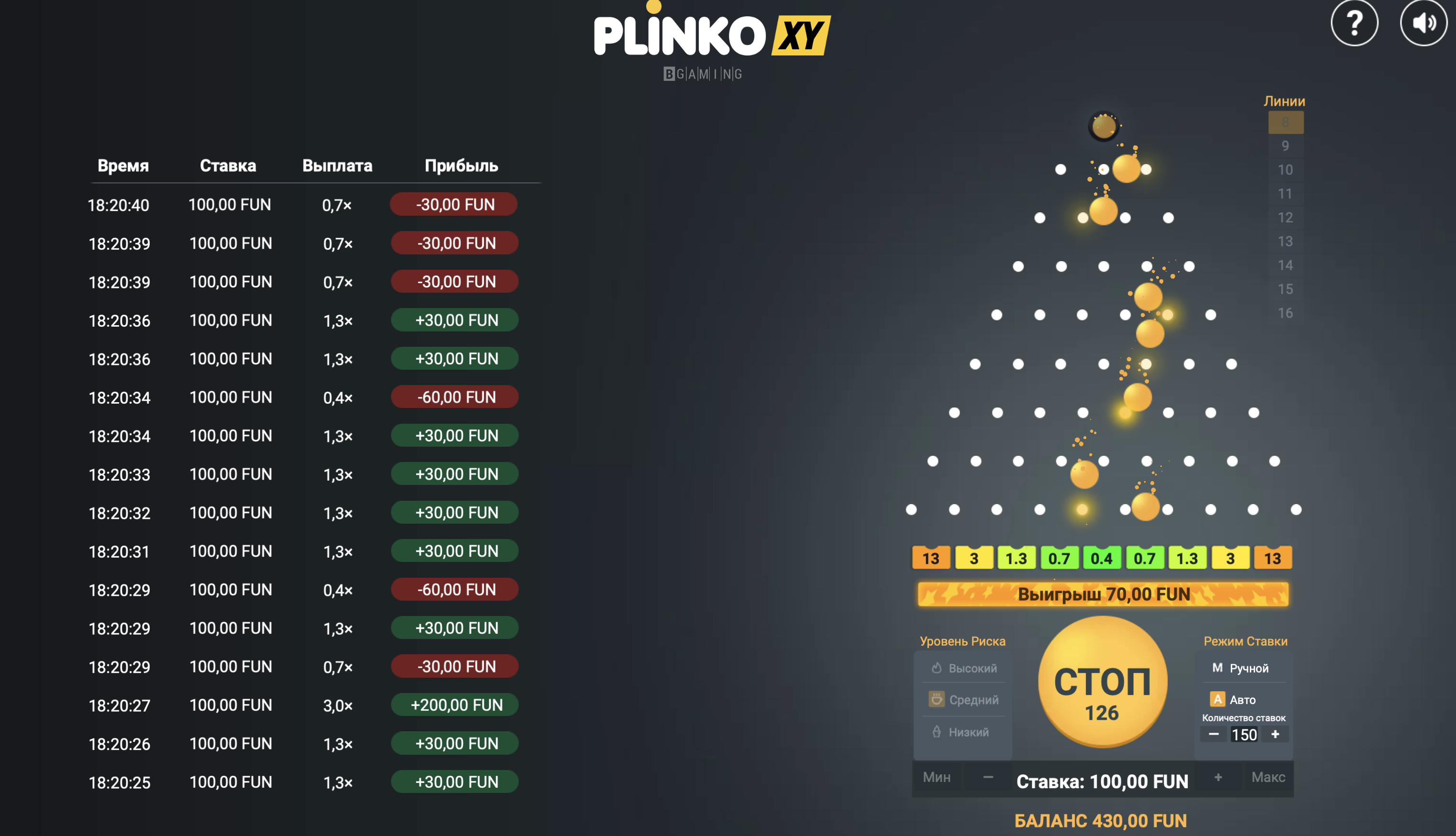 Se tudo estiver claro com os pontos principais, você precisará lidar adicionalmente com várias sutilezas. Plinko é um jogo onde em qualquer caso o nível de risco é no mínimo médio. Por que não alto? Porque sempre há um retorno. Mesmo acertar a bola na célula com o multiplicador mínimo leva à compensação parcial do valor da aposta. Se, por exemplo, for 0,2, o jogador tem a garantia de receber 20% de uma unidade convencional colocada. Mas isso não significa que você possa “voar” sem pensar e aleatoriamente para o Plinko. Resistência, estratégia, conhecimento das regras, capacidade de se controlar e monitorar emoções, administrar o equilíbrio – tudo isso é extremamente importante e até necessário.