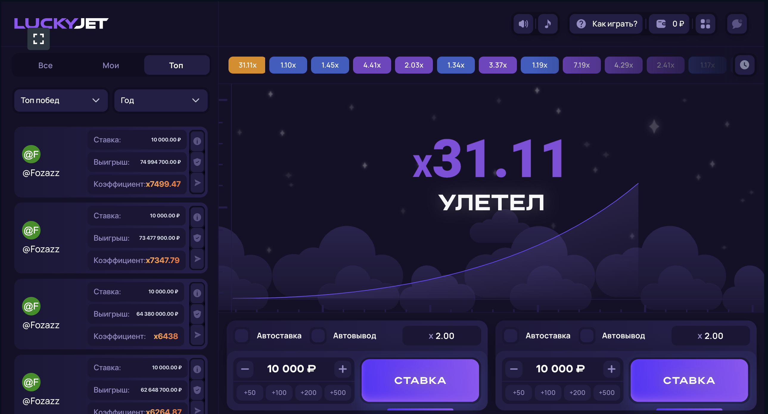 Ushbu 2 so’z Lucky Jet o’yinini to’g’ri va aniq tavsiflaydi. Har bir yangi o’yin bosqichi haqiqiy zavq va hayajon dengizidir. Siz pul yig’a olasizmi? Balki siz kichik pul tikib, asta-sekin pul ishlashga qaror qilgandirsiz? Harakatlar stsenariysi muhim emas: har qanday holatda, o’yin sizni befarq qoldirmasligiga kafolat beramiz. Biroq, shuni yodda tutish kerakki, xuddi Plinko bo’lgani kabi, g’alaba qozonish ehtimoli tasodifiy sonlar generatoriga bog’liq. Koeffitsientga qanday qiymat berilishini hech kim oldindan bilmaydi. Belgi o’yin maydonini tark etib, turni ikkiga qadar ko’paytiruvchi bilan yakunlashi mumkin va uning qiymati o’nlab o’lchanishni boshlagan paytda.